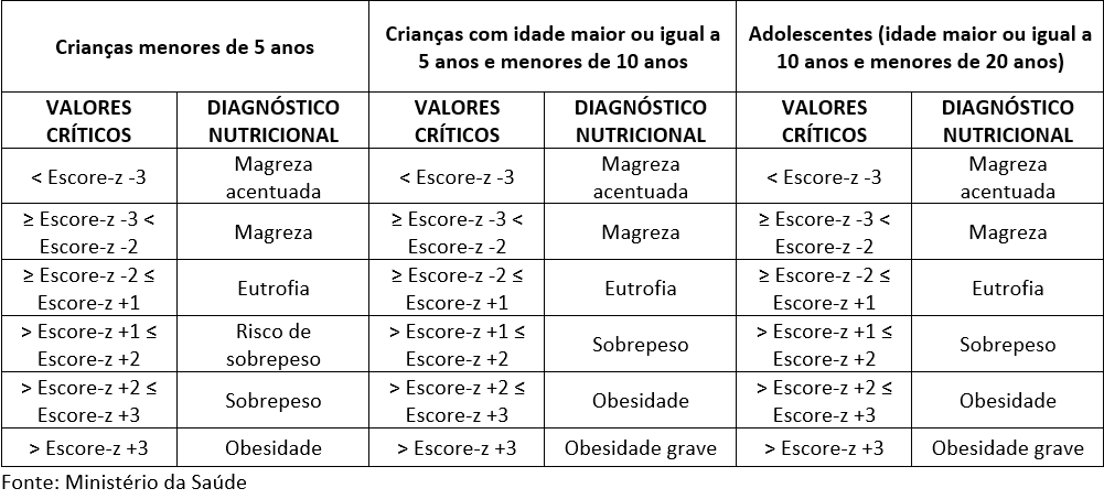 O estado nutricional das pessoas é diagnosticado a partir do Índice de Massa Corporal – IMC e segue padrões internacionais estabelecidos pela Organização Mundial da Saúde – OMS. O IMC relaciona peso e altura. É calculado dividindo-se o peso do paciente pela sua altura elevada ao quadrado. Os resultados são apresentados em termos de Escores-z, que podem indicar desde magreza acentuada até obesidade.